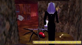 | ところが、Tank系ならば使えるTauntのSkillが無い為、棚の上のBatがうまく引きずり出せません。仕方無しにLevitateを掛けて、少し高い位置からBatを攻撃しておびき出していました。と・・・Tamyの目の前でLanyさんが地面に沈んで行きます・・・・・あら?。どうやら踏み外してLavaに落ちた様子。Levitateが効いているので怪我はありませんが、FGの横を通らないとここに戻ってこられないので、LanyさんはGateで一旦Lavaへ。棚の上以外のBatのPOPまでは、暫く時間があったので、Tamyはぼ〜っと待っているつもりだったのですが、そんな時に限ってNox PHのLDCがPOP。わぉ! 騎士様、Qが入っている事もあって頑張ります。LanyがまだLava Zoneで、Healerがいないので、騎士様のHPが無くなったらOutです。そこで、TamyもDoT・DDに加えて、Stunを連発して騎士様を援護! そしてついにLDC撃沈!「やった〜!」。SoloでのLDC Killは、Selline・Mottyを通しても初めて!。ついでにDing!で、TamyはLevel 50になりました。 |
