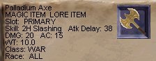 Sellineも、WAR用のAXEをひとつ貰って帰ってきました。 ACのおまけ付きだし、そこそこ良い武器かも・・・? 装備は出来ないので、装備時の絵は分からず。今度Tolwarn に装備させてみよっと。 |