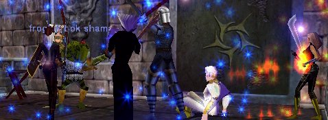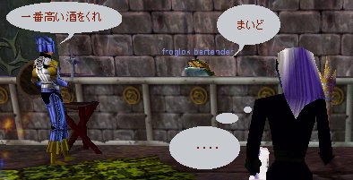 | 先日全滅したりもしたし、まぁ、無理しないで、行けるところまでいこうかぁ〜。と、言う事で、一応Bar目指して進むParty。難所のJail横の坂道で、次から次へとADDする蛙をKillしながら、「まぁ、退屈しないし、EXPも入るから、ここにずっといてもNPよ〜」と、お気楽ム〜ドでいたら、いつのまにかBreak完了・・・・。そのまま建物の中に。なんだかんだ言いながら、結局、無事にBarまで到達したPartyでありました。 |