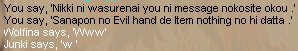 | SS Portalの鍵を落すドレーク君の下辺りに、ベンダーのいるお部屋がありました。ただここ、かなり迂回しないとたどり着けないみたいでした。Tamyから/conで、ベンダーさんはDoubでしたが、評判上げ魔法や変身魔法を使ってもお話してもらえず。だいぶ殺ってしまいましたからね〜。でも、FellineのSneakで何とか買い物が出来た模様です。で、FerisはめでたくSpellをGetしました。お目でと〜! |