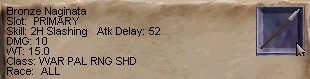 | 日本語武器シリーズ Bronz武器クラス(のようだ) 薙刀・刀(かたな)・太刀(たち)・槍・短刀・十手・鎖鎌・棒(1HB、2HBが3種類程?)等々。名前はなかなか笑えます。 右の写真はSellineに装備させた薙刀(なぎなた)。なかなかCoolかも・・でも、この薙刀、大きすぎてBagに入りません。TT。 |