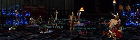 | どう言うAgroパターンをしたのか良く分からないのですが、大量のモンスターが次から次へとADDして、全滅。十分な分析は行えていないのですが、吹き飛ばし魔法で頭が天井にぶつかり、2Fのモンスターがそれに反応したのが原因では無いかと考察しています。2Fのモンスターは、Agroしても1Fまで降りてくることは無いみたいなのですが、ぎゃーぎゃー騒ぎながら走りまわるみたいなので、そこに更に1Fのモンスターが反応して行ったためかも知れません。 |