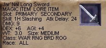 Sellineに・・・と言う事で、剣も貰ってきました。アイコンは、ただのLongSwordですけど、装備するとなかなか綺麗な剣です(写真撮り忘れ・・・TT)。レシオもそこそこですよね〜。Sellineが両手持ちで戦うときに愛用してま〜す。 |
