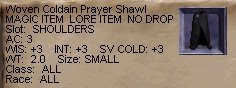 さて、ようやく1set分のSnow Griffin Eggが揃ったので、いよいよThurgadinショールの第3段階に挑戦です。第三段階のクエストは、食料品店での調理のバイトです。4種類の料理を作って順に配達すると、最後に良くやった!といってシールをくれます。このシールと、第2段階で貰ったショールを公会堂のとあるNPCに渡すと第三段階のショールがもらえます。途中、ポットを作るために鍛冶も少し鍛えたり、パイ生地を作るためにsnake eggを採りに行ったりと、かなり苦労しましたが、何とか第三段階まで行くことが出来ました。しかし・・・第2段階までは、Motty・Mottie・Tamyの3人がやっているので、あと2セットSnow Griffin Eggを集めたいところ・・・ふぅ・・・。Questそのものに付いては、EQ2001さんに詳しく出てるので、そちらをみてね〜!