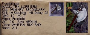GikonekoさんからFrostbringerを借りました。斧の癖に軽いし振りが速いし、Effectまでついてるし・・・・で、なかなか良い武器ですよね〜。 暫くお借りすることになりました。ありがと〜! |