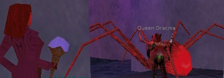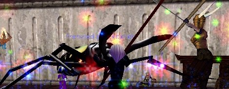 | 続いて、地下のDWFのまちを通り越して、Queenがいるクモエリアへ。ここでの目的は、クモ達が出す糸です。20個程はそろえたいところ。しかし、生憎、このクモの糸を集めている人がいて、クモは狩られてしまっていたのですが、取り敢えず20枚集めたら帰るからと言って、Queen Roomだけを占拠させてもらいました。彼、Queenには興味無かった模様(と、言うより、もうみんな持っていて、Loot出来ない状態なのでしょうね)。 |