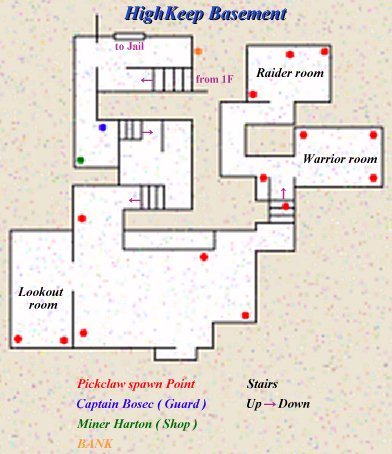 | [スポット案内] [Main Room] Bobエリアに入って、最初の大きな部屋です。ここの住人はGuards,Cabalists,Lookouts,Spiritstsたちです。 [Lookout Room] 大部屋から右に入った部屋で、ここが一番Levelが低いGobが出るようです。住人はLookouts,Cabalists,Spiritstsあたりです。 [Warriors Room] 地下3階へ続く階段を降りてすぐ右の部屋です。住人はWarriors,Visionaries,Guardsがいます。 [Raider Room] 地下3階の一番奥の部屋です。Raiders,Seers,Visionaries等がでます。 [BANK] 1階から地下1階へ降りてすぐのところにある銀行です。一応牢屋の中にある銀行と言う事になってるみたいですが・・・なんでこんなところに・・・^^;; でも、これがあるおかげで、HighKeepはとってもお手ごろな狩り場になっています。 [その他] ・色々お世話になります。感謝の意を込めて掲載します。Captain Bosecさん。 ・レベル低い人は要注意です。Prisone君は、見境無く襲ってきます。 |