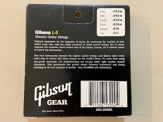 18日の写真ではGibsonL-5しか表記がなかったので裏面の写真載せます。 右下に900MLの表記ありますね。 左上にL-5の表記…ラウンド弦なのに(ーー;) そういえば私のL-5も購入時はラウンド弦でしたので、いつからかGibsonもフルアコにもラウンド弦張っていました。 .011では細いので900M(.012~)の弦だと思いますが。 900シリーズは3弦が巻き線のセットで、 L(.010~) ML(.011~) M(.012~) の三種類がありました。 J-160Eには.011~がおすすめでしたのでPyramidのPureNickel弦でゲージセットにしてオーダーしたのです。 |