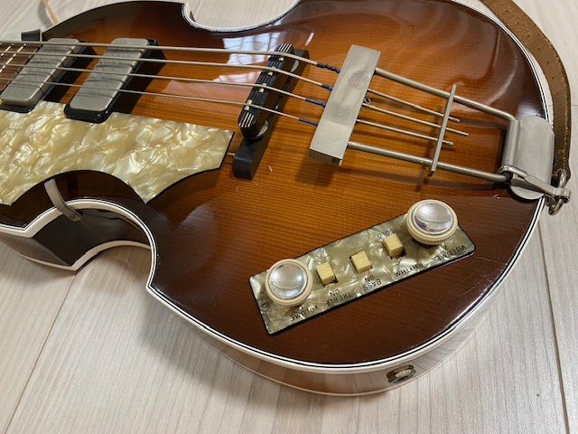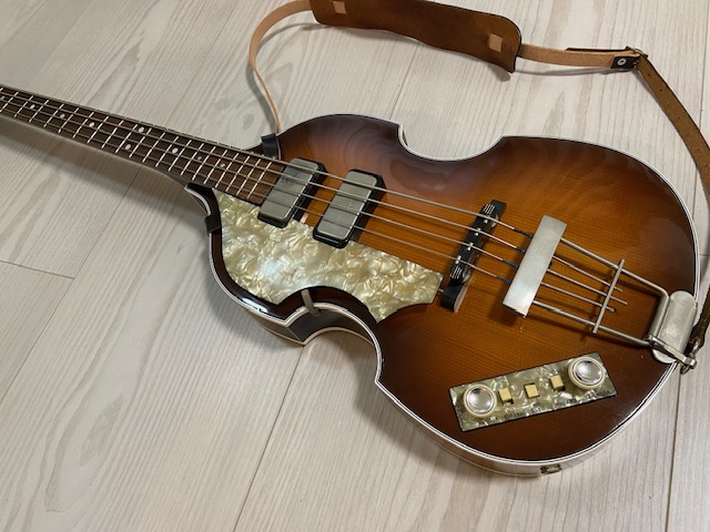 近況報告 My Gear Hofner500/1cavern solid Top 1998年より愛用しておりました。 途中ピックガード、コントロールパネルが劣化してしまいwithオリジナルピックガードとコントロールパネルに2000年の中頃に交換しました。 その後問題なく使用してましたが、ついにセルが劣化を始めました(>_<) 8月に工房に入院!セルの巻き直しをしました。 復活! 写真では分かり難いですが私のHofnerのイメージでは現在の新品より白いと思ってましたので巻き直しのセルは真っ白にしました。 Beatles come to townです。 あの動画のHofnerのセルとGeorgeのGretschiのまぶしい白w ・・・憧れでした。 劣化したので踏ん切りがつきましたw 最近の楽器は焼け色を意識して少しあめ色になってますよね。 写真ではちょっと分かり難いですが実際はセルがはっきりして気に入ってます。 またうまく写真が取れたらアップします(^^♪ |