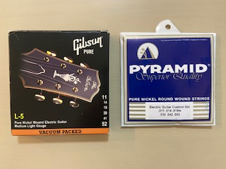 よくある質問でPyramidのラウンド弦では茶色のパッケージと写真のように青色のパッケージがありますが、 茶色のパッケージのsetのほうが安いのでそちらで作らないのですか? と聞かれます。 理由は写真の通りで生産中止になったGibsonの900MLのパッケージを見てお分かりかと思いますが、 Pyramid青のパッケージの弦はGibsonと同じPure Nickel Woundだからです。 Pyramid茶色のパッケージはNickel Woundなんです。 できるだけGibson900MLと同じにするためにこの弦にしてます。 |